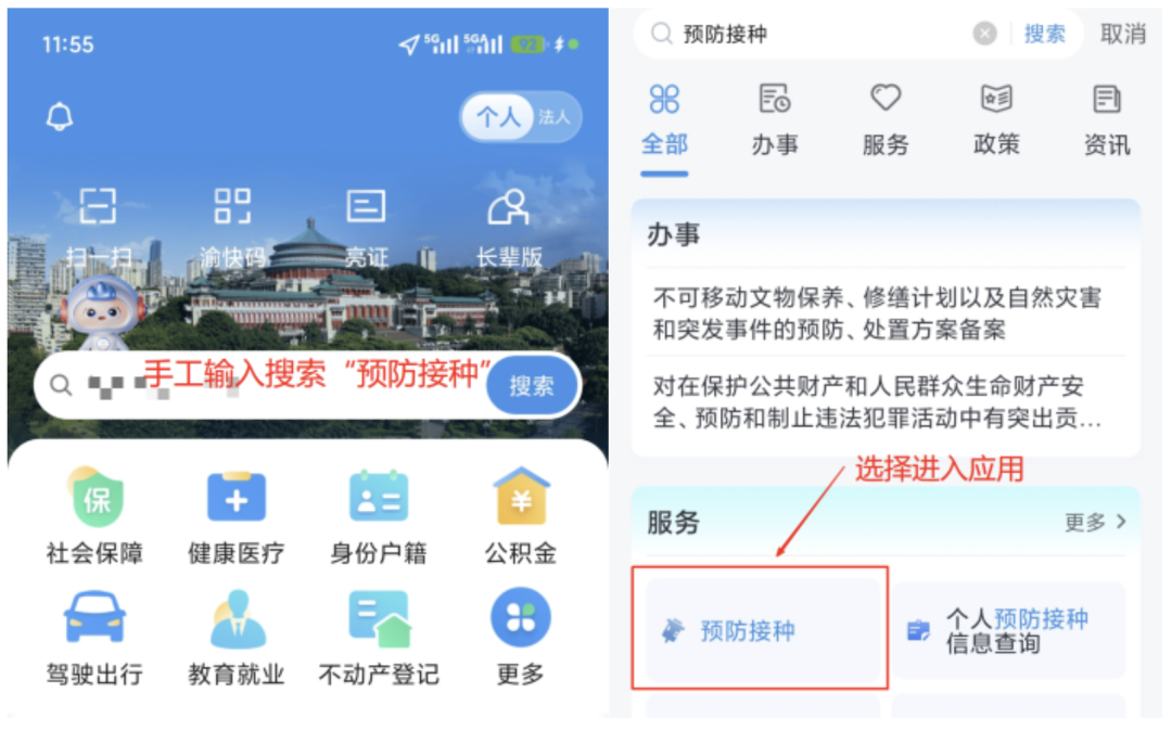 02在“渝快办”首页搜索栏搜索“预防接种”,选择服务“预防接种”打开(建议将“预防接种”添加到“我的常用”里面,方便后期使用)。