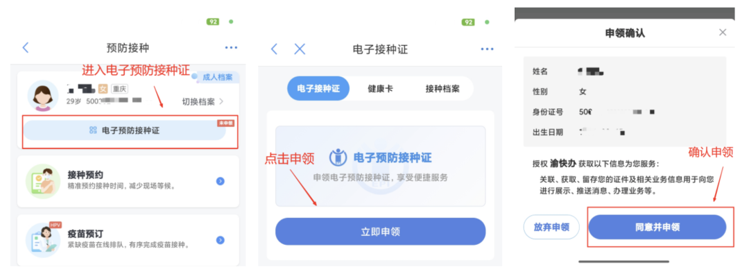 04进入“电子预防接种证”,点击“立即申领”,选择“同意并申领”确认。