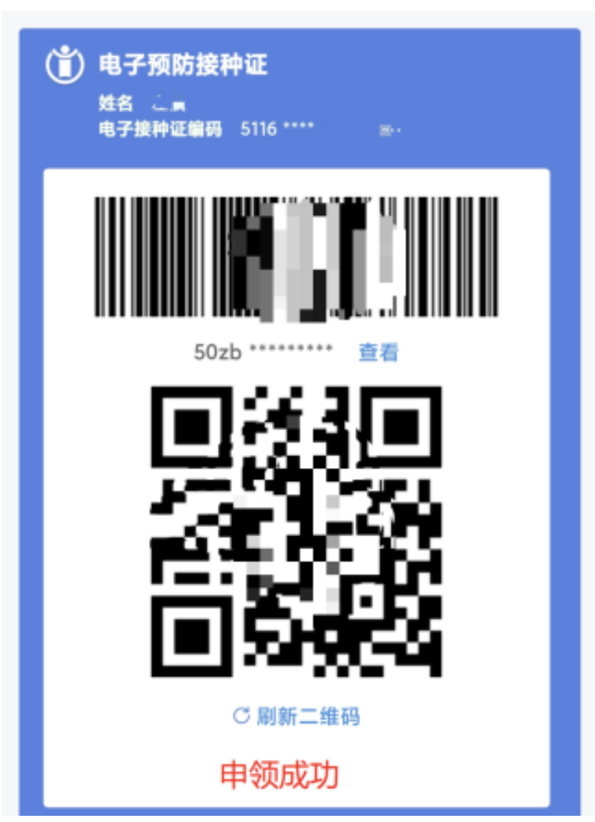 05申领成功(提示申领成功后会显示一个二维码,该二维码为动态码,可以在接种时的各环节使用)。