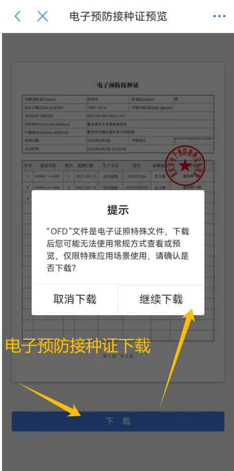 2.点击底部的下载,会弹出“OFD文件”提示,无需担心,点击“继续下载”即可。下载的OFD文件可通过WPS进行查看。