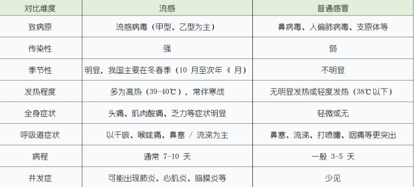 到底什么是流感?很多人容易混淆感冒与流感。简单来说,普通感冒症状较轻,多以局部呼吸道症状为主,恢复较快;流感则常“病来如山倒”,高热、全身酸痛等症状明显,还可能引发严重并发症。