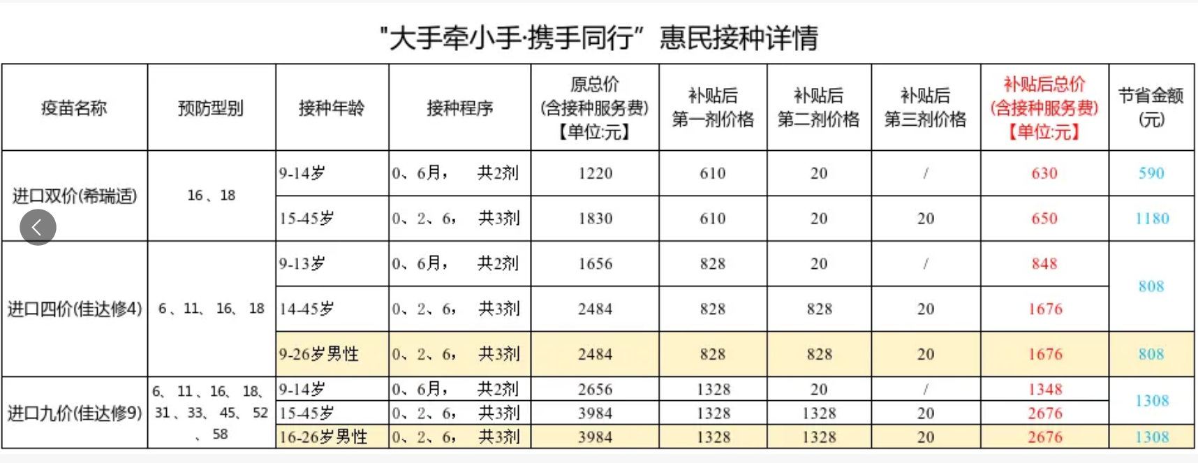 与此同时,重庆市2025-2026年度初二年级在校女学生HPV疫苗接种工作正式启动,初二女生可享“补贴+减免”双重福利。接种进口四价、九价HPV疫苗的,最后1剂疫苗费用免费。补助和减免后的疫苗费差额部分和疫苗接种服务费(20元/剂)由受种者家长(监护人)承担,详情可咨询当地预防接种门诊。由于9-14岁女孩全程接种进口九价HPV疫苗仅需要2剂次,相当于2剂次只需1剂次费用,同时享受政府补贴120元/人,福利叠加后,该年龄段初二女生全程接种进口九价HPV疫苗,仅需1228元。