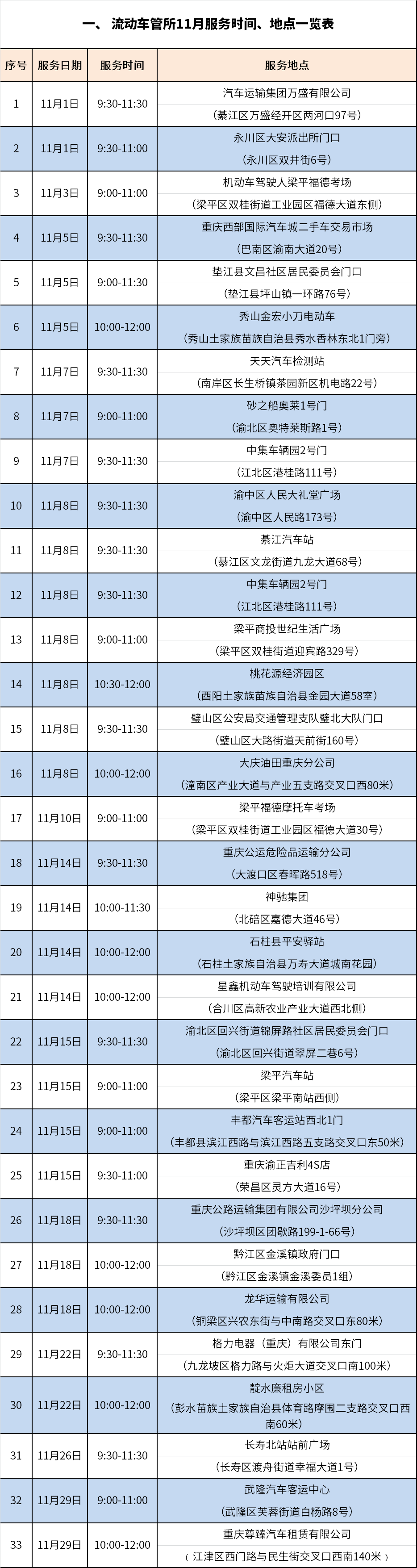为方便驾驶人办理补(换)证、变更备案、抵押(解除)登记、摩托车检验等车驾管相关业务,市公安局交通管理局制定了流动车管所2025年11月服务计划,将组织33场车驾管上门服务,请市民根据业务办理需求,查看服务时间,按时前往办理相关业务。