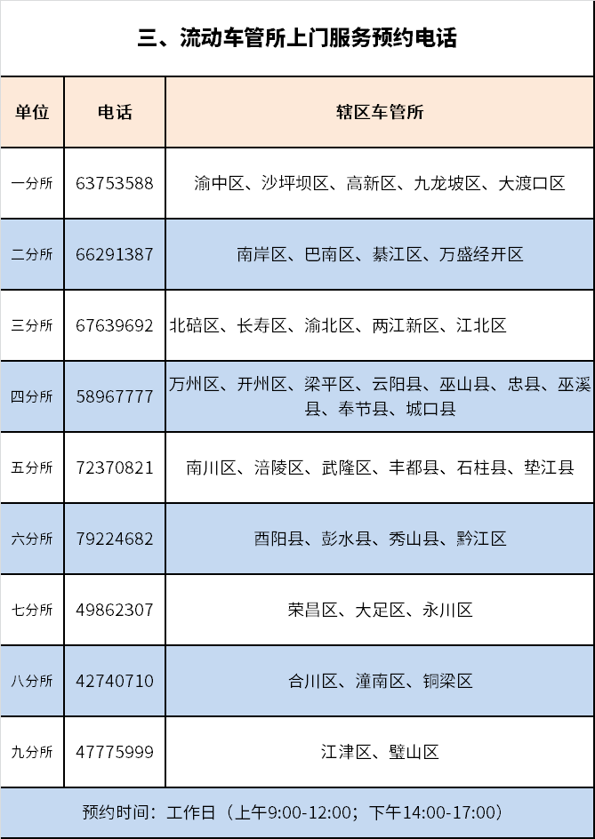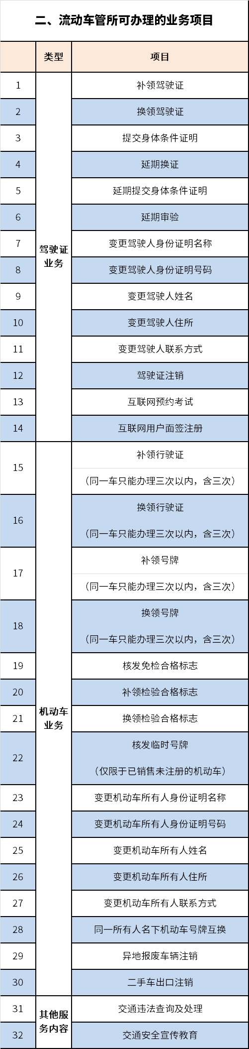 注:具体办理业务项目请向流动车管所现场工作人员咨询。