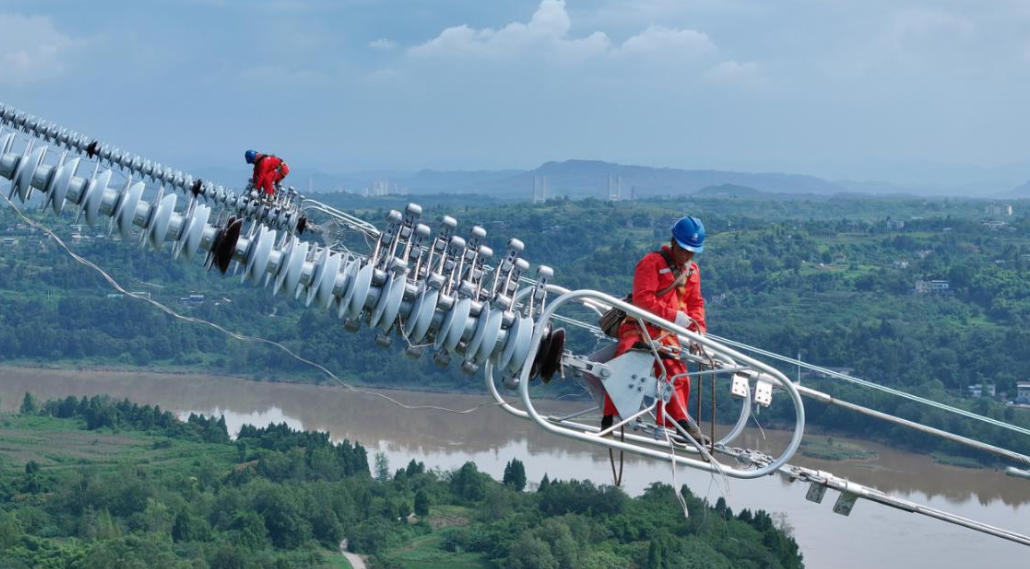 重庆送变电公司员工在500千伏渝岳线跨嘉陵江江段安装间隔棒。受访单位供图
