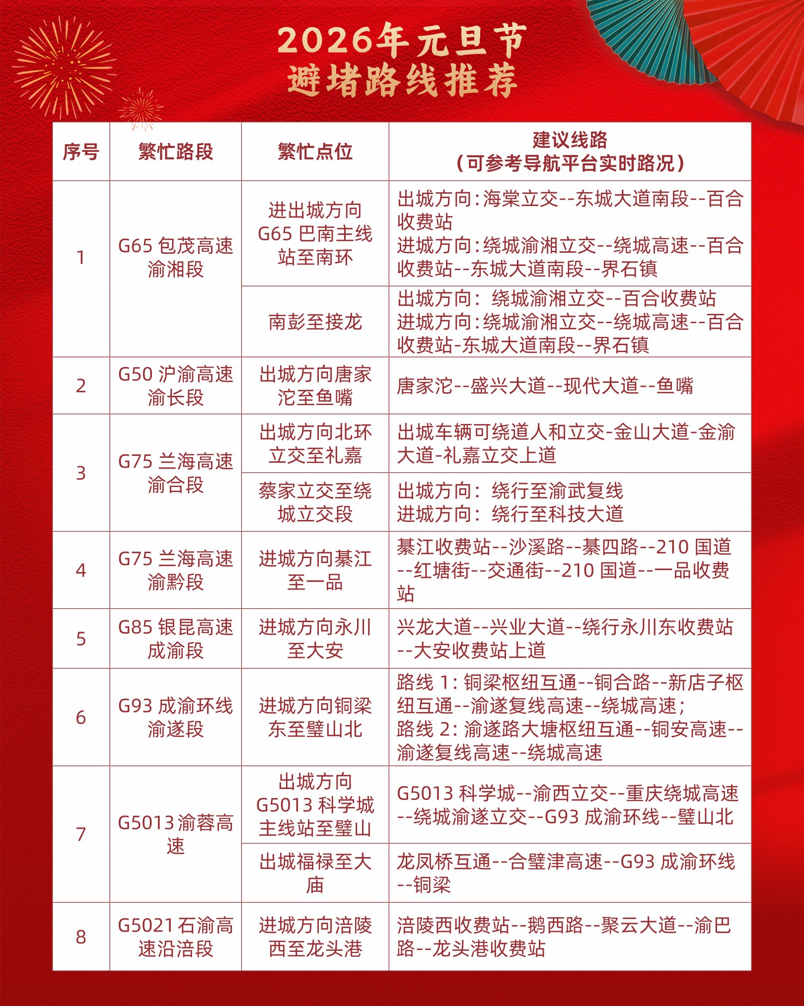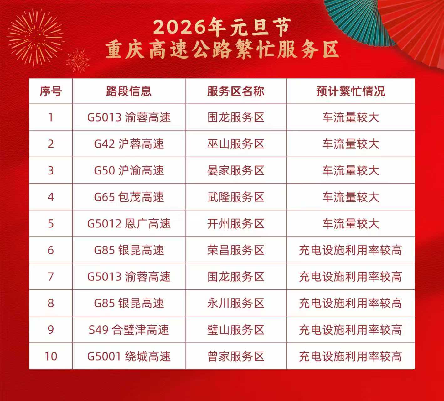 第1眼TV-华龙网讯(记者 刘艳)元旦假期将至,26日,重庆高速集团发布重庆高速公路2026年元旦出行服务指南。