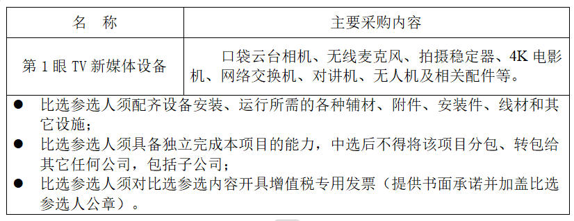 本次竞争性比选项目是重庆广播电视集团(总台)第1眼TV新媒体设备,比选内容包括但不限于第1眼TV新媒体设备的设备采购、配送、现场安装、调试、售后服务等,具体内容及主要要求详见《项目技术需求》章节。