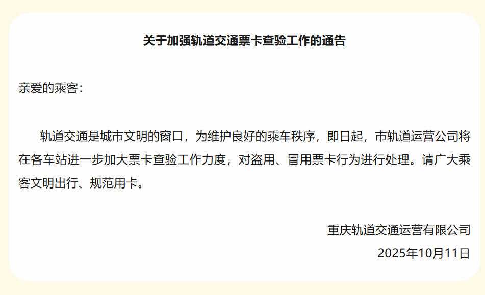 日前重庆轨道交通发布《关于加强轨道交通票卡查验工作的通告》